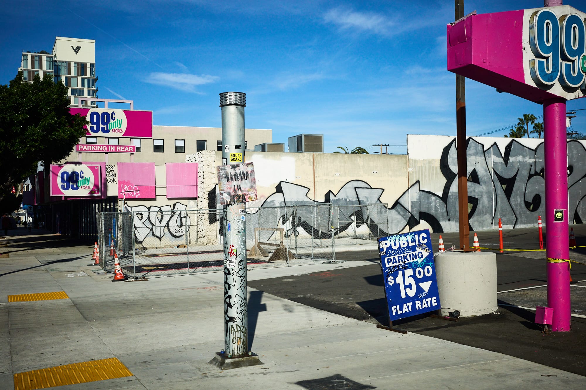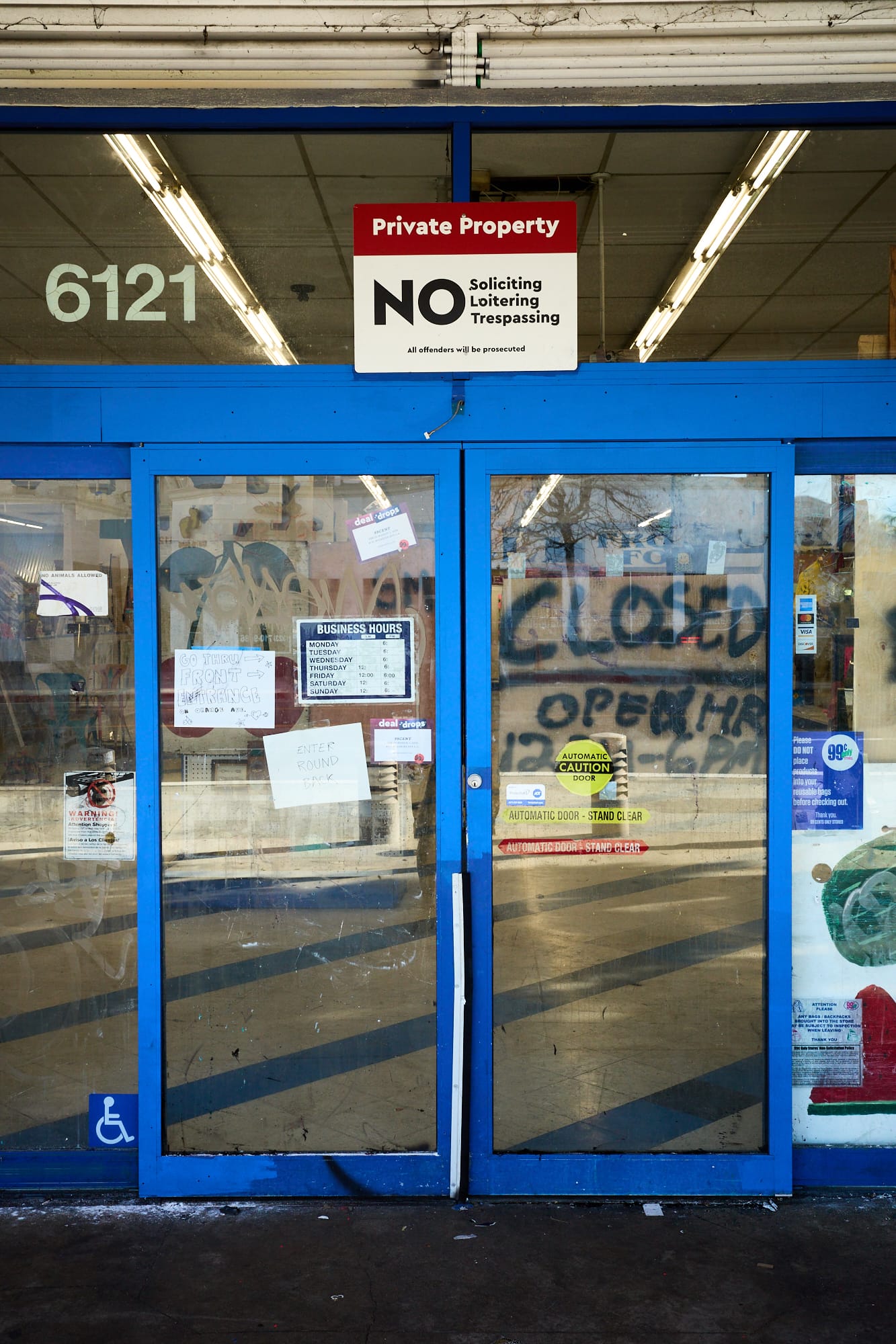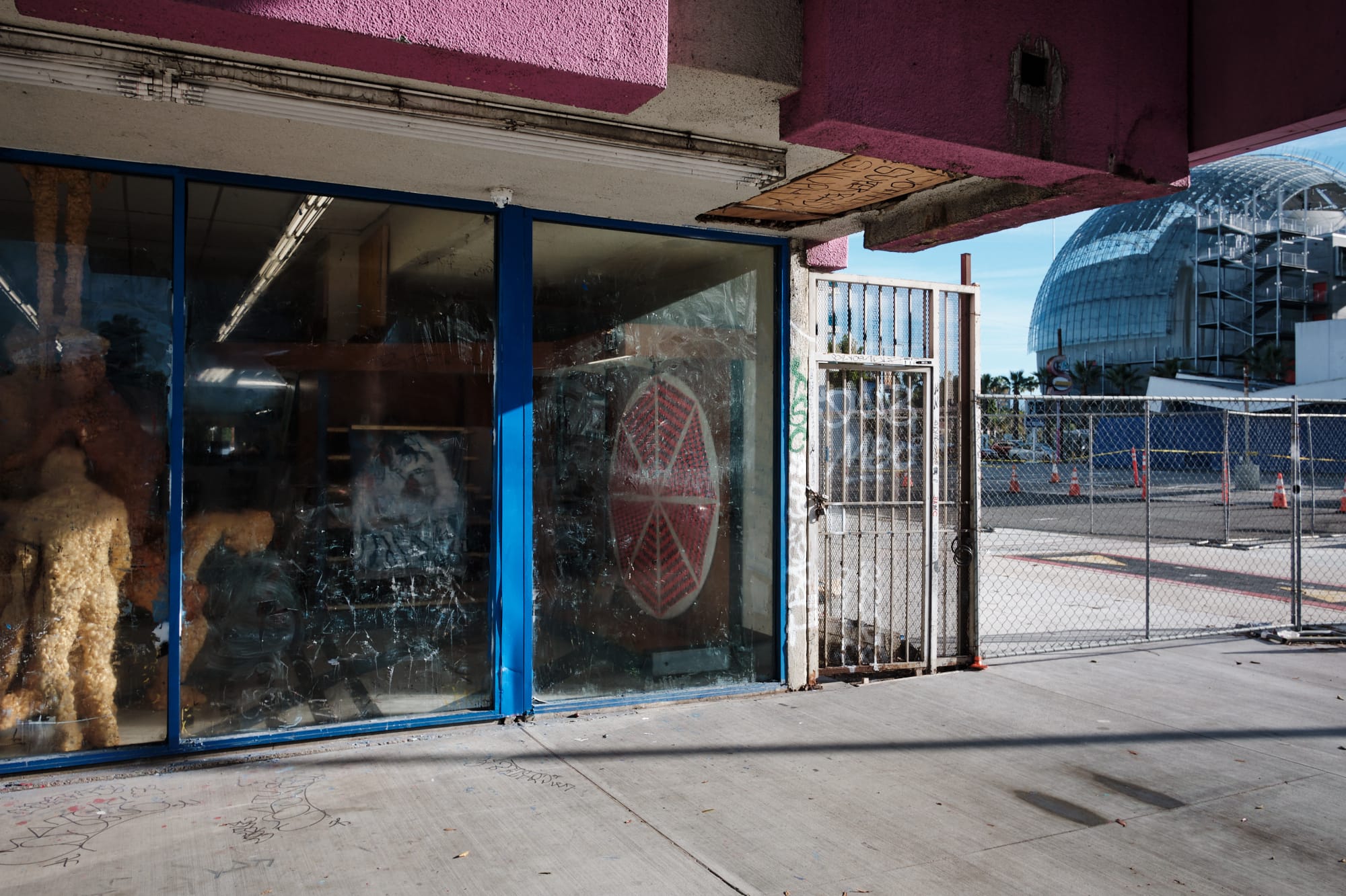 All of the images that I have come across from the event are (rightfully so) focused on the amazing art that fills the aisles of this dilapidated store and the interior in general. As a documentary landscape photographer, how it all looked in context with the surrounding neighborhood were of the greatest interest to me. This stretch of Wilshire is a study in contrast, with the cutting edge architectural structures of Museum Row to the east of Fairfax Blvd. directly across from what is almost an entire block of shuttered businesses immediately to the west (where the former 99 Cents Store is located).