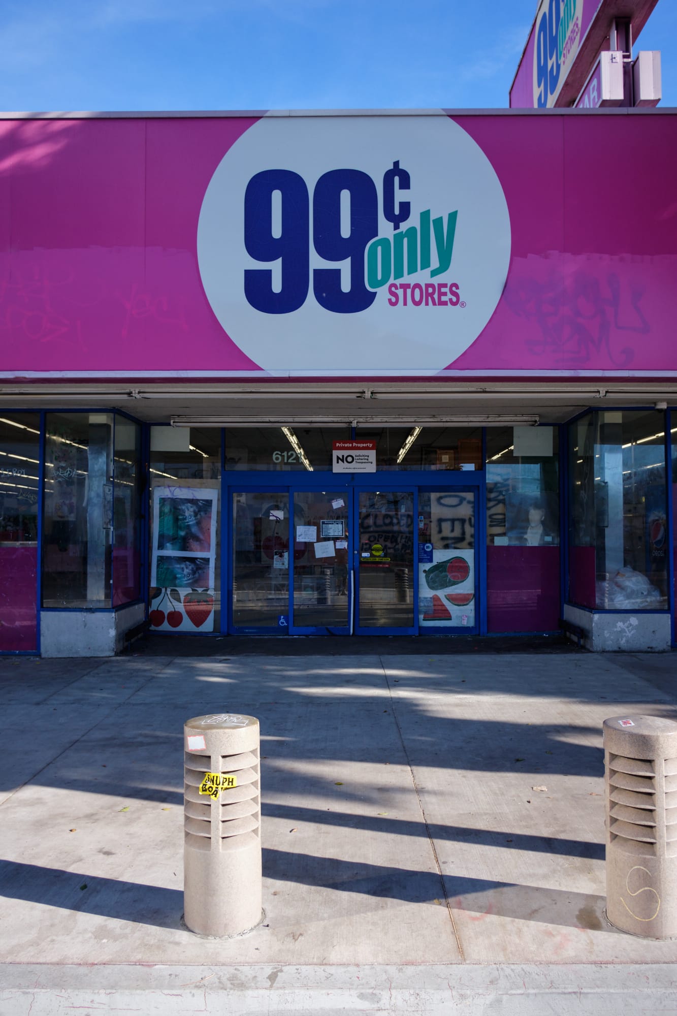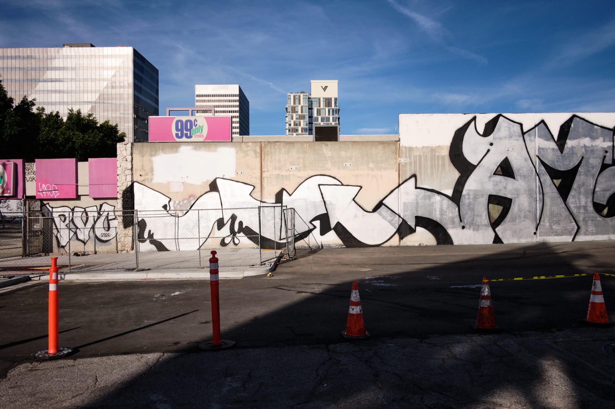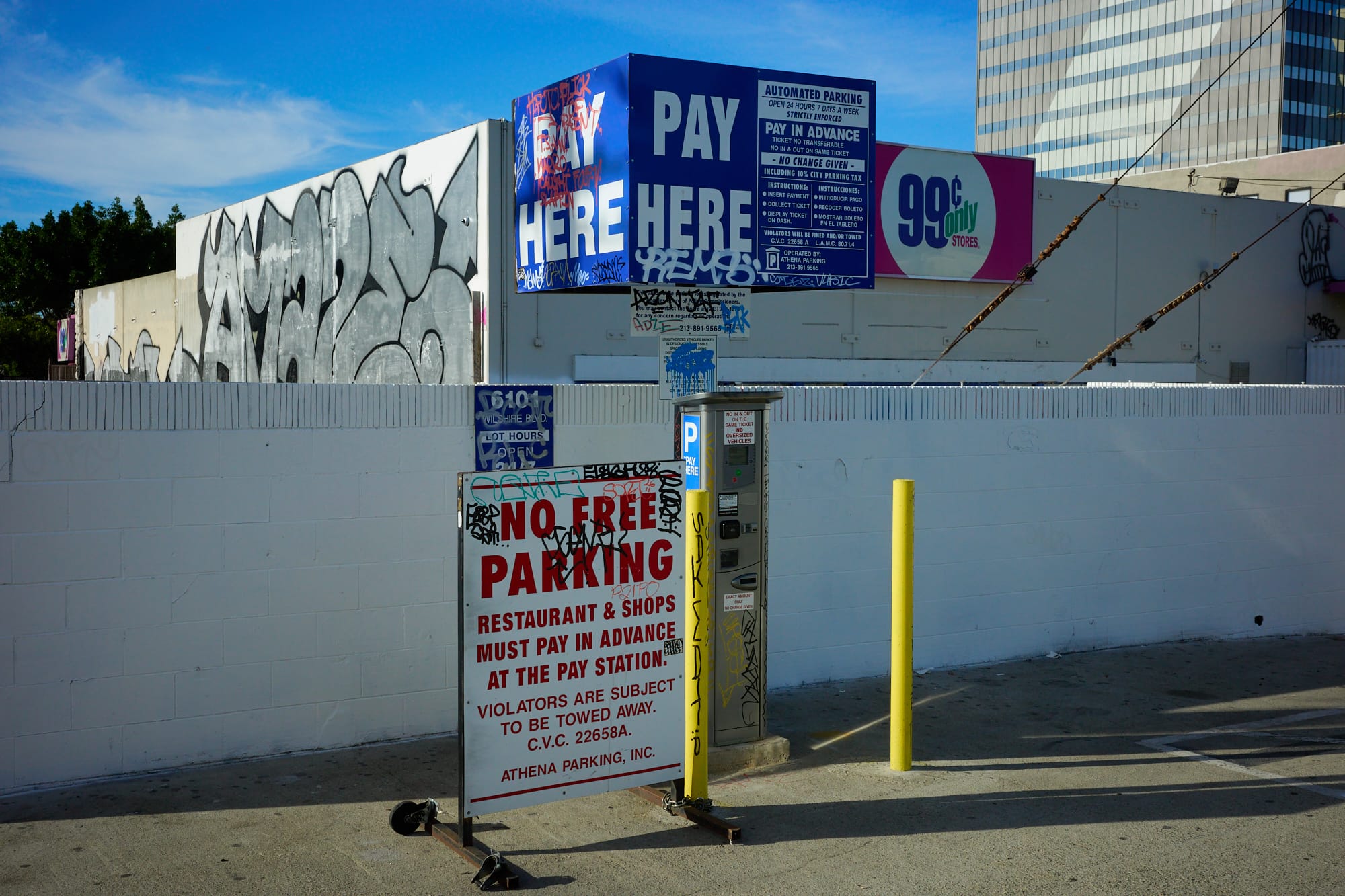 All of the images that I have come across from the event are (rightfully so) focused on the amazing art that fills the aisles of this dilapidated store and the interior in general. As a documentary landscape photographer, how it all looked in context with the surrounding neighborhood were of the greatest interest to me. This stretch of Wilshire is a study in contrast, with the cutting edge architectural structures of Museum Row to the east of Fairfax Blvd. directly across from what is almost an entire block of shuttered businesses immediately to the west (where the former 99 Cents Store is located).